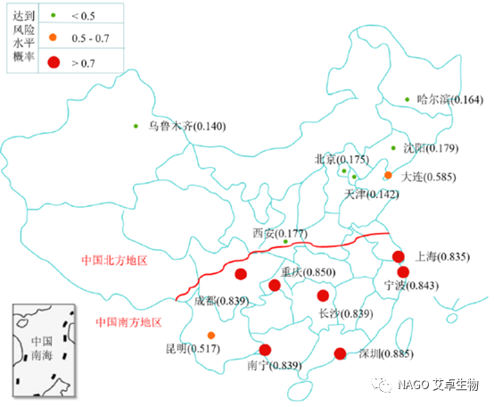 中國地域遼闊,塵螨的分布呈現(xiàn)南北差異。南方潮濕,塵螨密度高,北方和西部相對干燥,塵螨也相對少一些。有研究者基于機(jī)器學(xué)習(xí)建立了螨害風(fēng)險預(yù)測模型,評估我國不同地區(qū)塵螨侵害風(fēng)險等級(見圖2),預(yù)測結(jié)果也同樣體現(xiàn)了塵螨南多北少的特點。