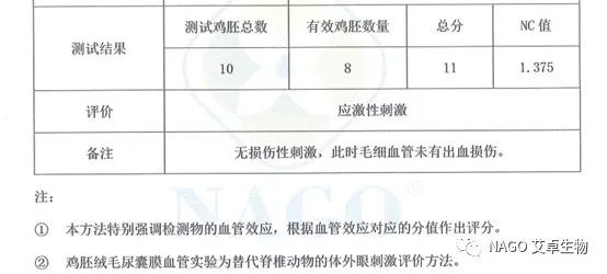 通過雞胚絨毛尿囊膜血管試驗(CAMVA),0.2%凈螨易的NC值僅有1.375,此濃度表現(xiàn)溫和,對毛血細(xì)管沒有損傷性刺激。