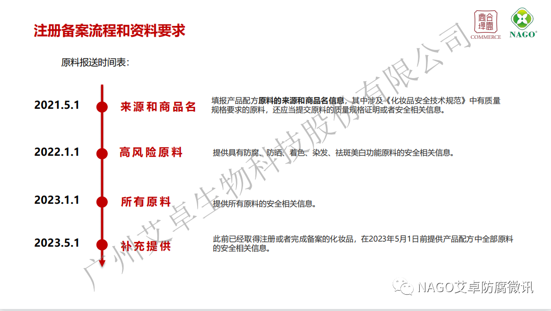 (3)自2023年1月1日起,注冊人備案人申請注冊或者進行備案時,應當按照《規定》的要求,提供全部原料的安全相關信息。此前已經取得注冊或者完成備案的化妝品,注冊人、備案人應當在2023年5月1日前補充提供產品配方中全部原料的安全相關信息。